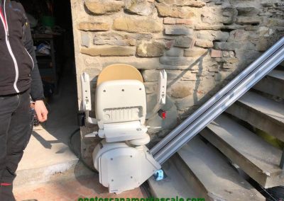 Siamo in questo caso di fronte ad un impianto un po’ particolare poiché si tratta di un montascale installato in ambiente esterno: per la precisione si tratta di un servoscala a poltrona rettilineo.
